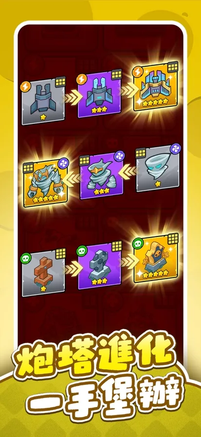 4、炮塔进化系统,利用六大自然元素和多种造型炮塔,通过合成提升至最高形态,增强战斗力。