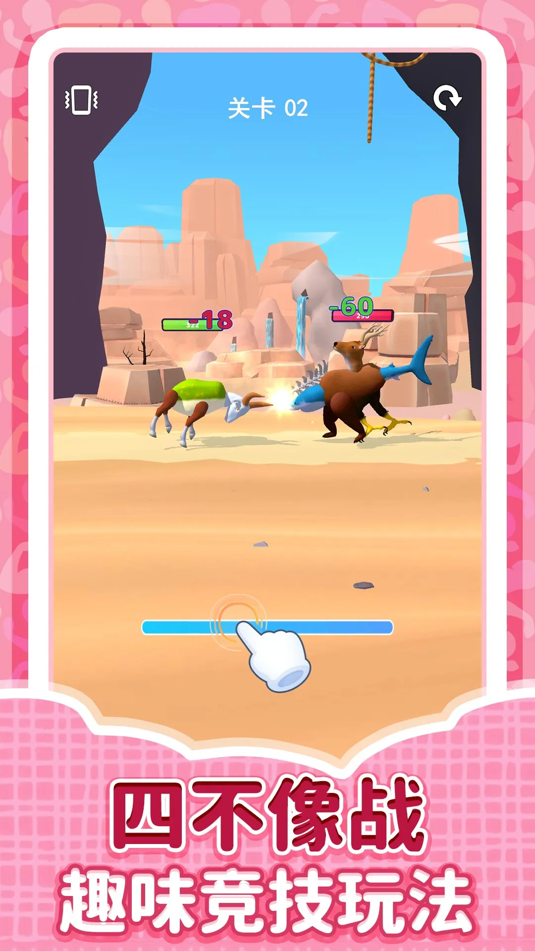 4、玩法流程清晰:进入关卡先选动物身体,再选四肢、头部等组成新动物对决。战斗时手指滑动屏幕操作,击败对手闯关,积累解锁更多肢体组装新动物。该游戏适合安卓系统,资源下载稳定,无恶意弹窗,安装简单,功能完整。